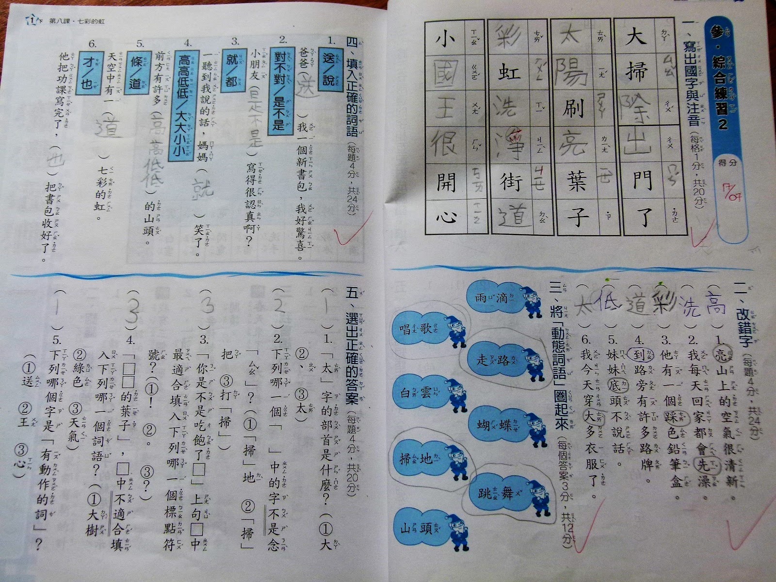 Kilka stron z "Ćwiczenia z pomysłem" - trochę o przymiotnikach, zapisywaniu i różnych formach imion, a także o znakach drogowych (które są inne niż na Tajwanie).